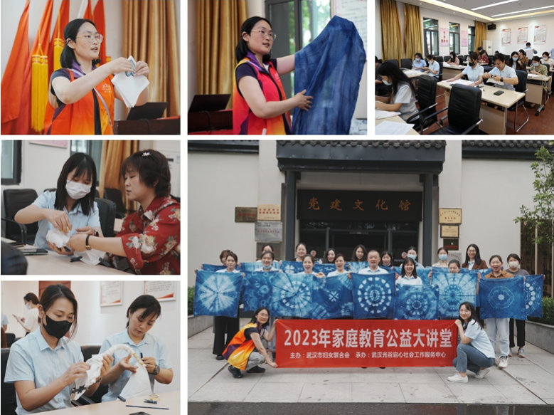 本次活動(dòng)邀請(qǐng)武漢光谷啟心社會(huì)工作服務(wù)中心老師進(jìn)行指導(dǎo)?;顒?dòng)開(kāi)始,老師向大家介紹了扎染的歷史與傳承,隨后老師現(xiàn)場(chǎng)演示幾種扎染花紋的扎節(jié)方式以及操作技巧,扎節(jié)時(shí)松、緊、疏、密的不同,使得扎染成品花色圖案千差萬(wàn)別,絢麗多姿。隨后,參會(huì)人員紛紛發(fā)揮著自己的想象力創(chuàng)造力,扎染出屬于自己獨(dú)一無(wú)二的花紋。