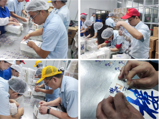 為確保樓20謝恩師定制產(chǎn)品順利生產(chǎn)上市,生產(chǎn)黨支部、財務審計黨支部響應號召,充分發(fā)揮黨員先鋒模范作用,開展產(chǎn)品貼標活動。時間緊、任務重,黨員們在車間工作人員指導下有序進行貼標,埋頭苦干、一絲不茍,與一線員工齊奮斗,本著不浪費一張標,不貼花一個盒子原則,保質(zhì)保量完成任務。