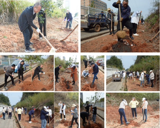 活動中,大家利用鋤頭、鐵鍬等工具,挖坑、放樹苗、填土、澆水、培土,相互配合、齊心協(xié)力,經(jīng)過不斷努力,將近百棵樹苗成功栽種,一株株桂花樹幼苗挺拔于春風(fēng)中,傳遞著黃鶴樓酒的品牌生機(jī)與活力。