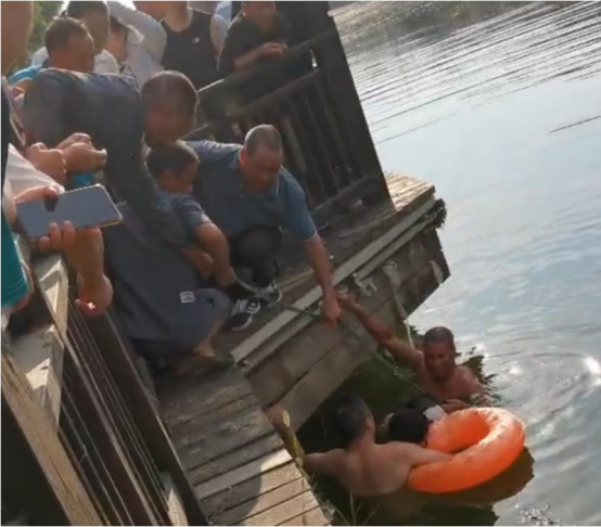 放眼看去,十幾米外的通羊河邊已經(jīng)圍了不少人,快步跑到河邊,看到一位婦女不慎落入水中。黃國勇顧不得多想,即刻躍入水中進行救援,吳仕田急中生智找來電瓶車拉繩用來拉起落水者。黃國勇用盡全力將落水者托出水面,隨后,另一位聽到呼救的群眾也一起下水參加救援,二人用拉車繩將落水婦女固定后,岸上的人借力拉起,多方合力,最終成功將落水者營救上岸,整個救援過程持續(xù)了近20分鐘。