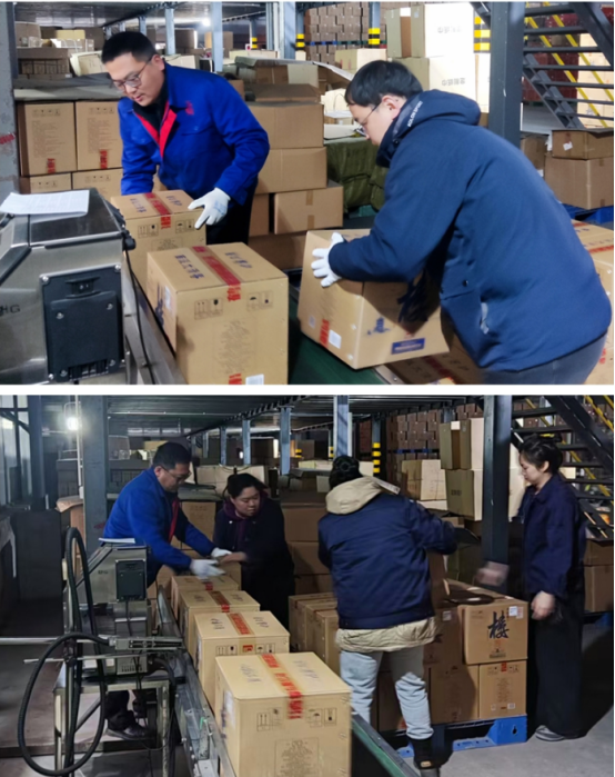 歲末年關,市場需求擴大,訂單激增,待噴字發(fā)貨的成品酒每天達上千件,生產(chǎn)黨支部響應號召,組成一支由黨員先鋒帶頭的噴字隊伍深入生產(chǎn)一線。時間緊,任務重,黨員、積極分子、團員為一箱箱成品酒噴上客戶名,現(xiàn)場人員各司其職,齊心協(xié)力,以實際行動踐行一切服務銷售,助力旺季攻堅戰(zhàn)。