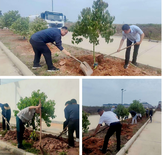 活動(dòng)現(xiàn)場(chǎng),全體黨員分為挖樹、種樹兩隊(duì),挖樹隊(duì)手持工具,小心將樟樹從一號(hào)酒庫施工場(chǎng)地挖起;種樹隊(duì)則在污水處理站和糟場(chǎng)同步作業(yè),快速完成扶樹、澆水、填土等工序。最終,在大家的高效協(xié)作下,30余棵樟樹全部移栽到位,充分保障了一號(hào)酒庫的順利施工。