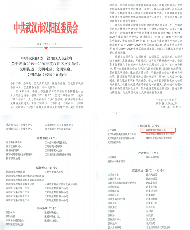 新年伊始喜訊傳,1月21日黃鶴樓酒業(yè)被中共武漢市漢陽區(qū)委員會授予“2019-2020年度區(qū)級文明單位”榮譽(yù)稱號。