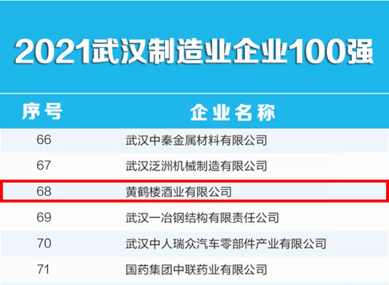 8月23日,2021年武漢企業(yè)100強(qiáng)榜單發(fā)布,黃鶴樓酒業(yè)榮登2021武漢制造業(yè)企業(yè)100強(qiáng)。