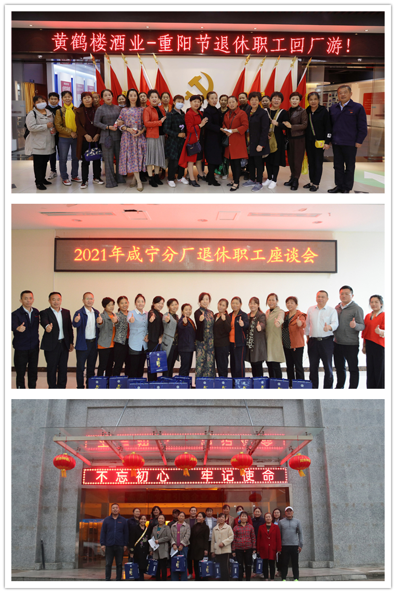 三地回廠活動形式多樣。武漢組織回廠游,帶領(lǐng)老員工們重溫故地,把酒言歡。咸寧、隨州開展座談會,了解退休職工生活現(xiàn)狀并介紹公司目前的發(fā)展形勢,送上佳節(jié)祝福與禮品,組織觀看企業(yè)宣傳片,暢談黃鶴樓酒業(yè)未來發(fā)展新藍圖。