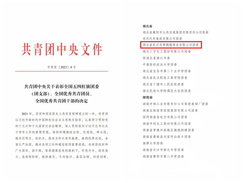 2022年是中國共青團成立100周年。近日,共青團中央作出表彰決定,頒發(fā)全國五四紅旗團委、全國五四紅旗團支部、全國優(yōu)秀共青團員、全國優(yōu)秀共青團干部等榮譽稱號。其中,共青團黃鶴樓酒業(yè)有限公司委員會獲評全國五四紅旗團委稱號。