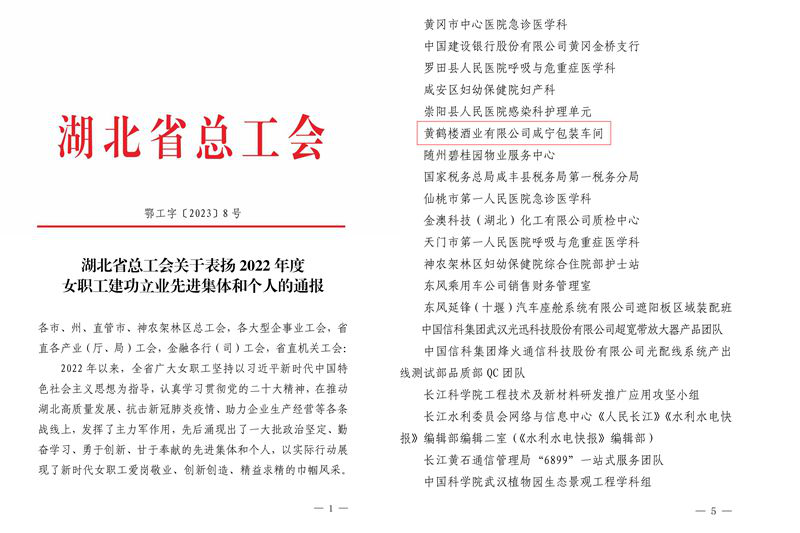 近日,湖北總工會表彰一批2022年度女職工建功立業(yè)先進集體和個人,黃鶴樓酒業(yè)咸寧包裝車間喜獲“湖北省女職工建功立業(yè)標兵崗”榮譽稱號。