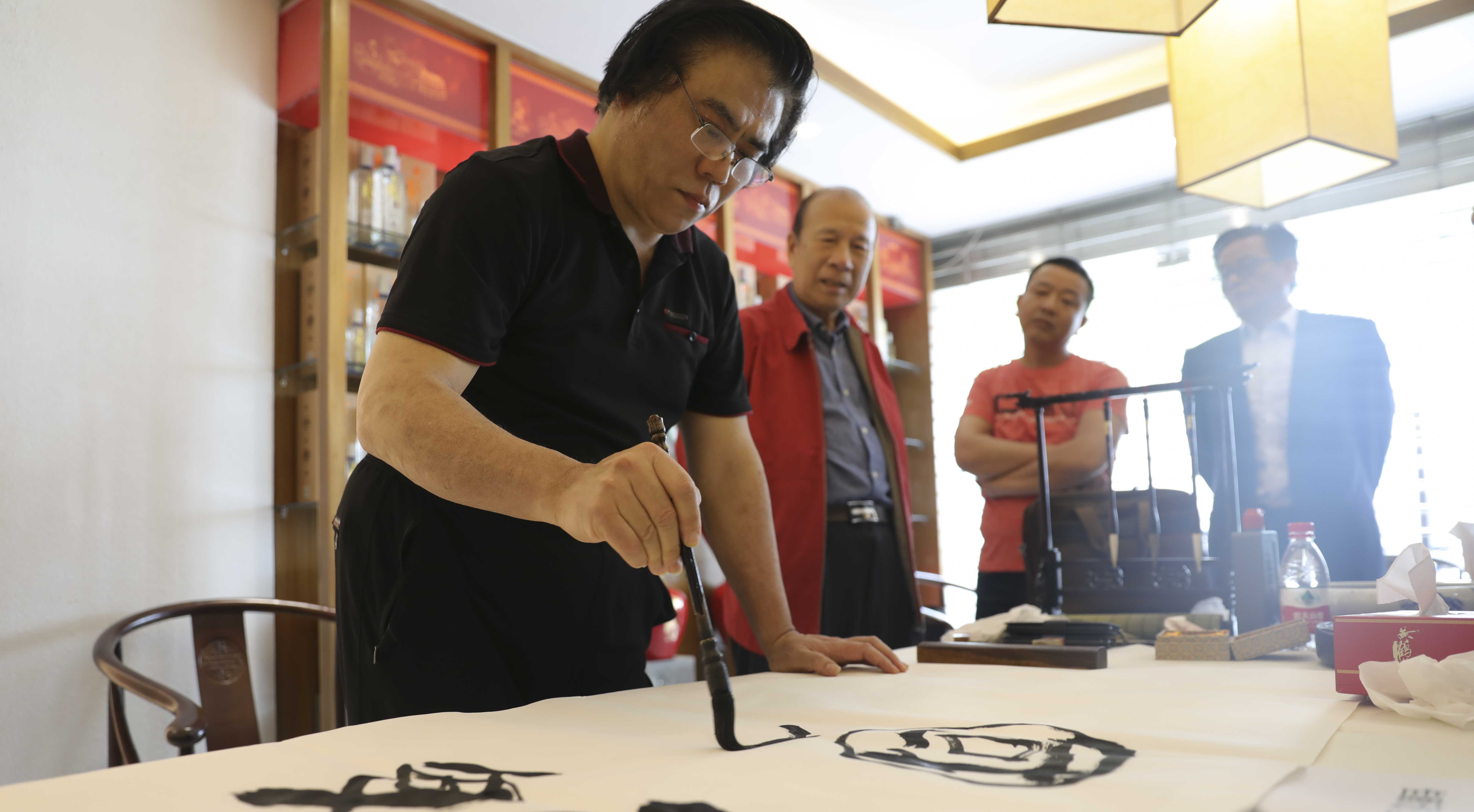 參觀結(jié)束后,作為香港文藝界的領(lǐng)軍人物,張孝勇?lián)]毫潑墨,向黃鶴樓酒敬贈(zèng)了墨寶題詞。